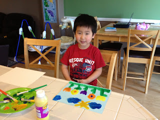 We also tested out toilet paper tube stamps again. This time we made flowers, an idea Nonna had found on Pinterest for us. They worked pretty well, but you had to push the petals down and Isaiah wasn't a fan of getting messy.